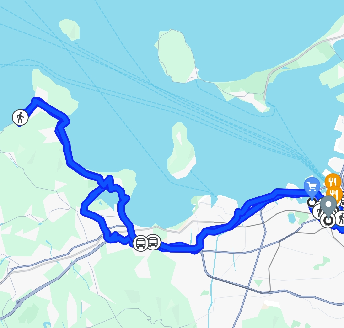 하지만, 덕분에 갈 때 바다 뷰를 볼 수 있는 오른쪽 좌석도 편히 선점했다 완전 럭키비키 잖아! 참고로 편도 1250엔임. (1박에 준하는 여행이고 도시도 작아 대부분 걸어 다니고 필요할 때 택시만 잠깐 씩 탈 목적이었기 때문에 버스 패스는 안 샀다)