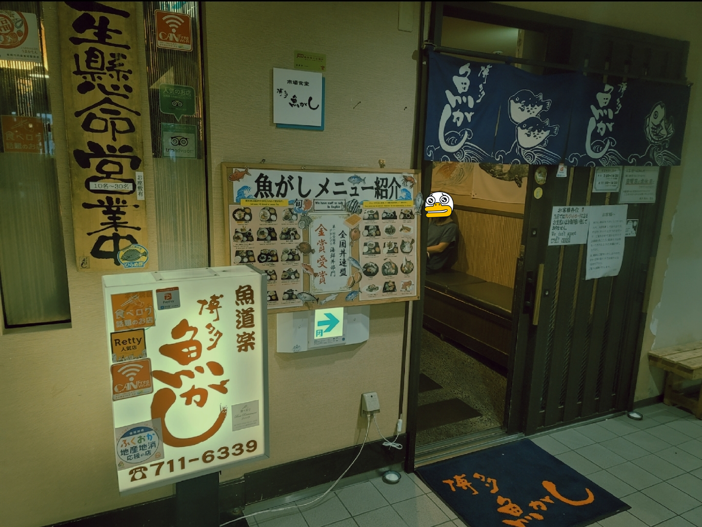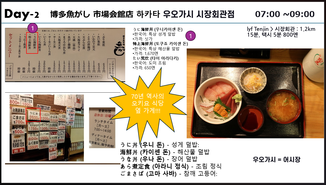 계획>... 70년 역사를 자랑한다는 오키요 식당을 가고 싶었지만 9시에 연다고 하여 옆에 있다는 경쟁가게 (몇 년 된 지는 모르지만), 7시에 여는 하카타 우오가시 시장회관점으로 정한다...