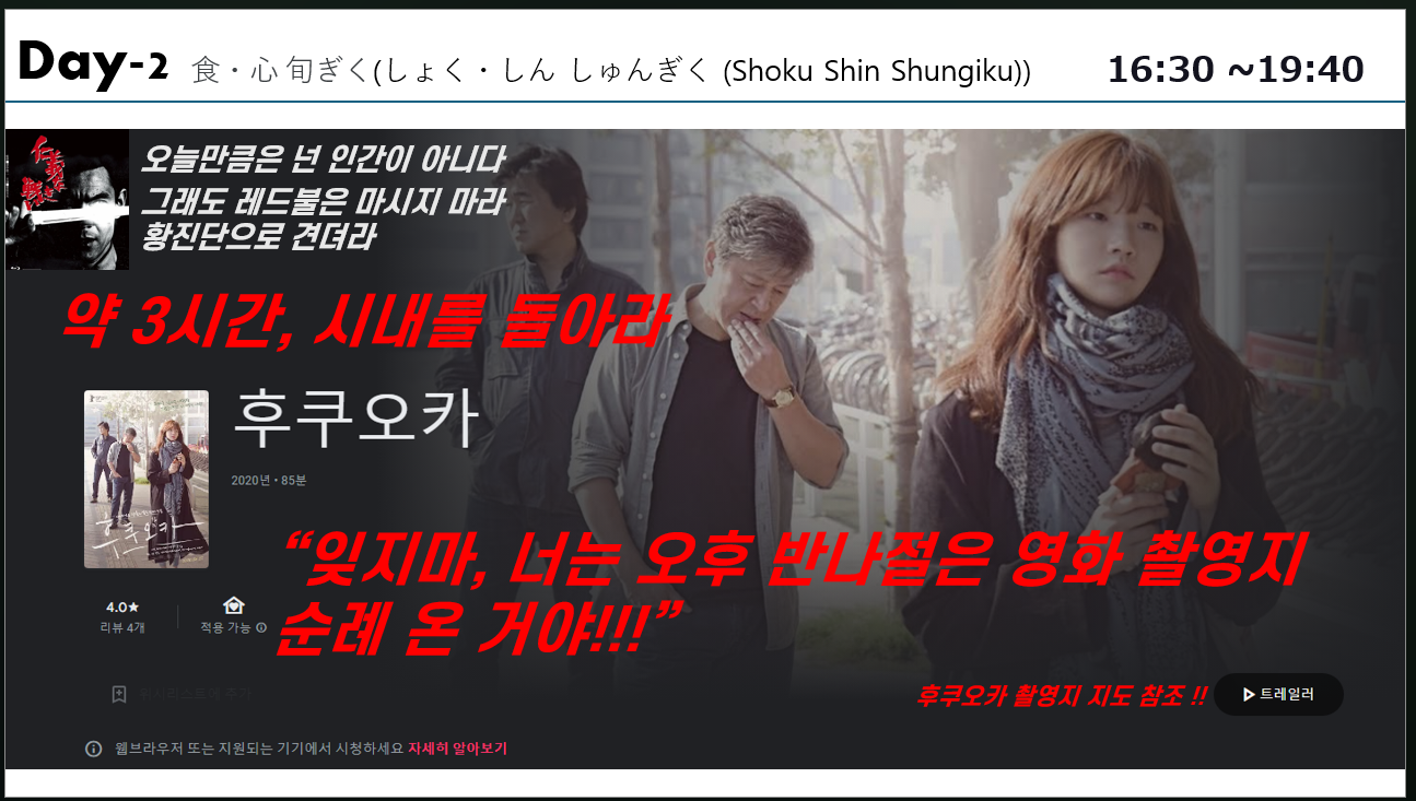역시 많은 변수들이 발생했지만 결국 80% 이상은 성공한 것 같다. 도시 내 영화 촬영지 범위가 작은 게 큰 도움이 된 것 같다. 자, 그럼 본론으로.