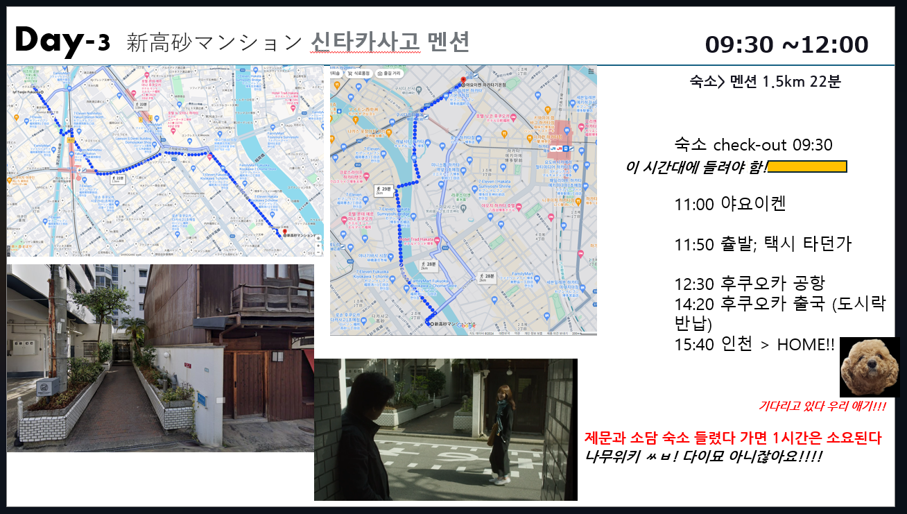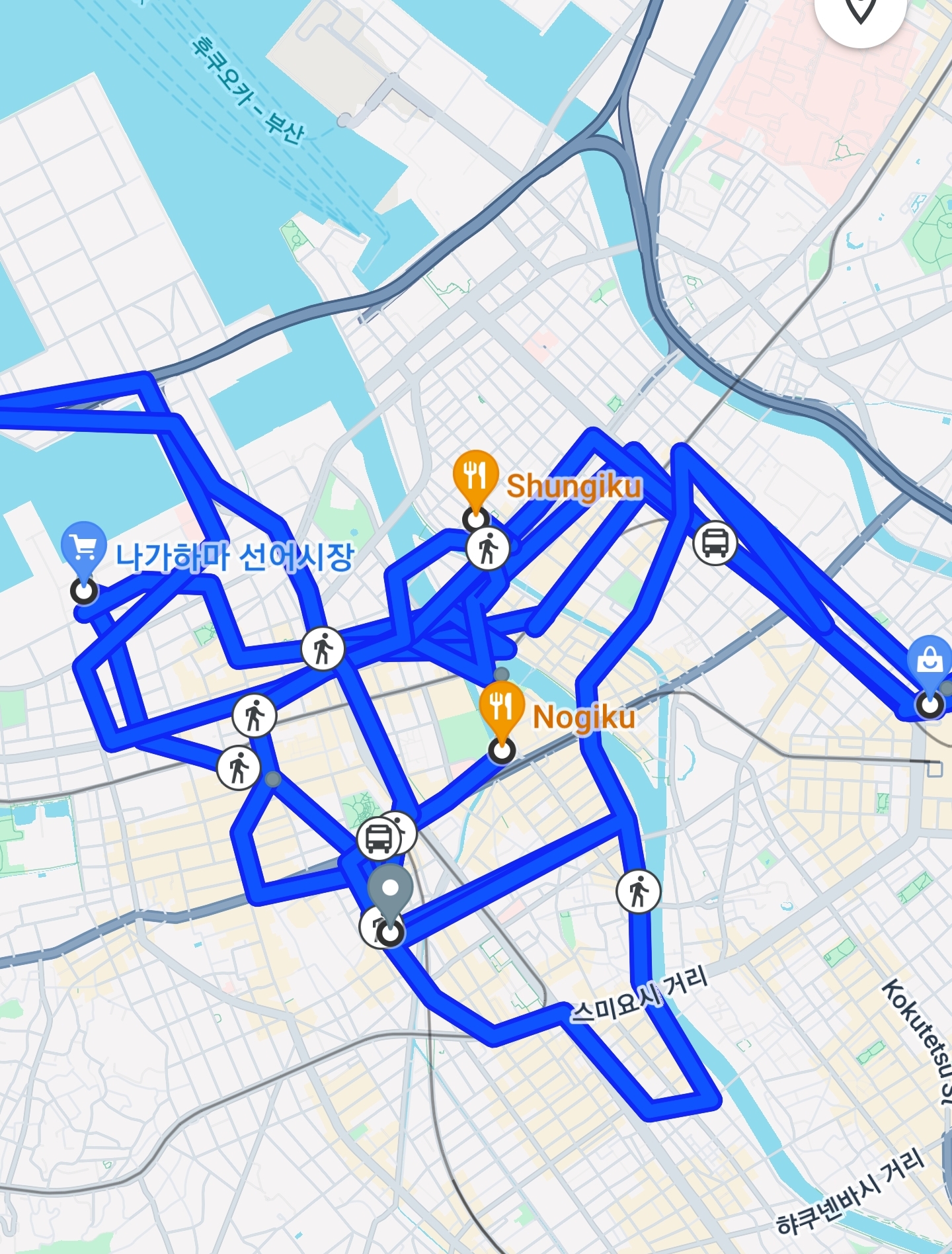 결과> 숙소로 와서 후딱 체크인하고 짐 내려놓고 하니 아니 벌써 밤 10:40분. 재빨리 구글맵 길 찾기 설정 후 노기쿠로 걸어 걸어 출발!