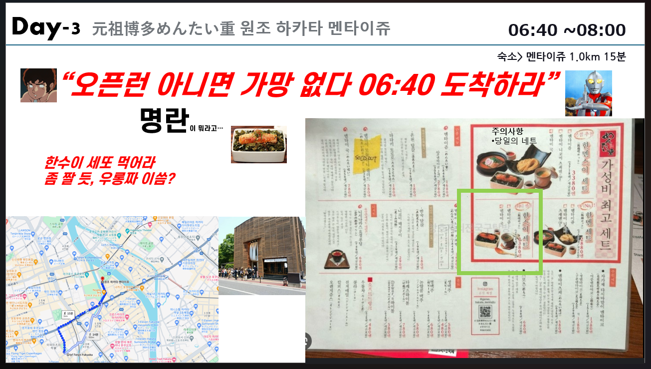 계획: 귀국하는 아침과 오전을 어떻게 알차게 쓸 수 있을까? 후쿠오카는 명란이 유명하다는데 줄을 미친 듯이 슨다는 원조 하카타 멘타이쥬로 가보면 어떨까 한다. 호텔에서 도보로 15분이니 나쁘지 않다. 마침 7시에 연다고 하니 6시 40분 즘 가면 괜찮지 않을까 하는 망상을 한다. 일단 이곳으로 결정