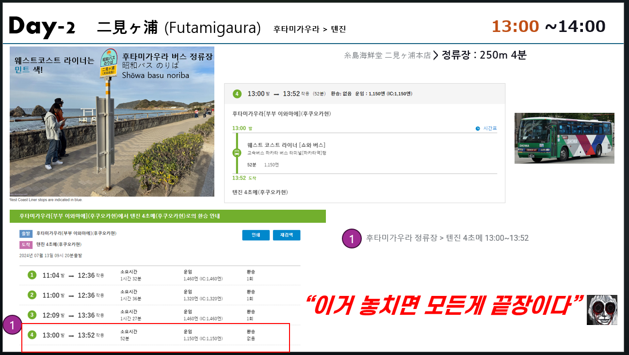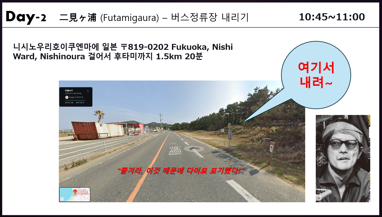 계획: 텐진으로 돌아오는 버스 시간을 보니 후타미가우라에서 바로 내리는 것보다는 좀 일찍 내려서 바닷가 풍경 보면서 걸어가는 게 어떨까 싶어 니시노우리 호이쿠엔마에라는 곳에서 내리기로 한다. 대략 Palm Beach 전 정류장에서 내리면 되어 보인다...