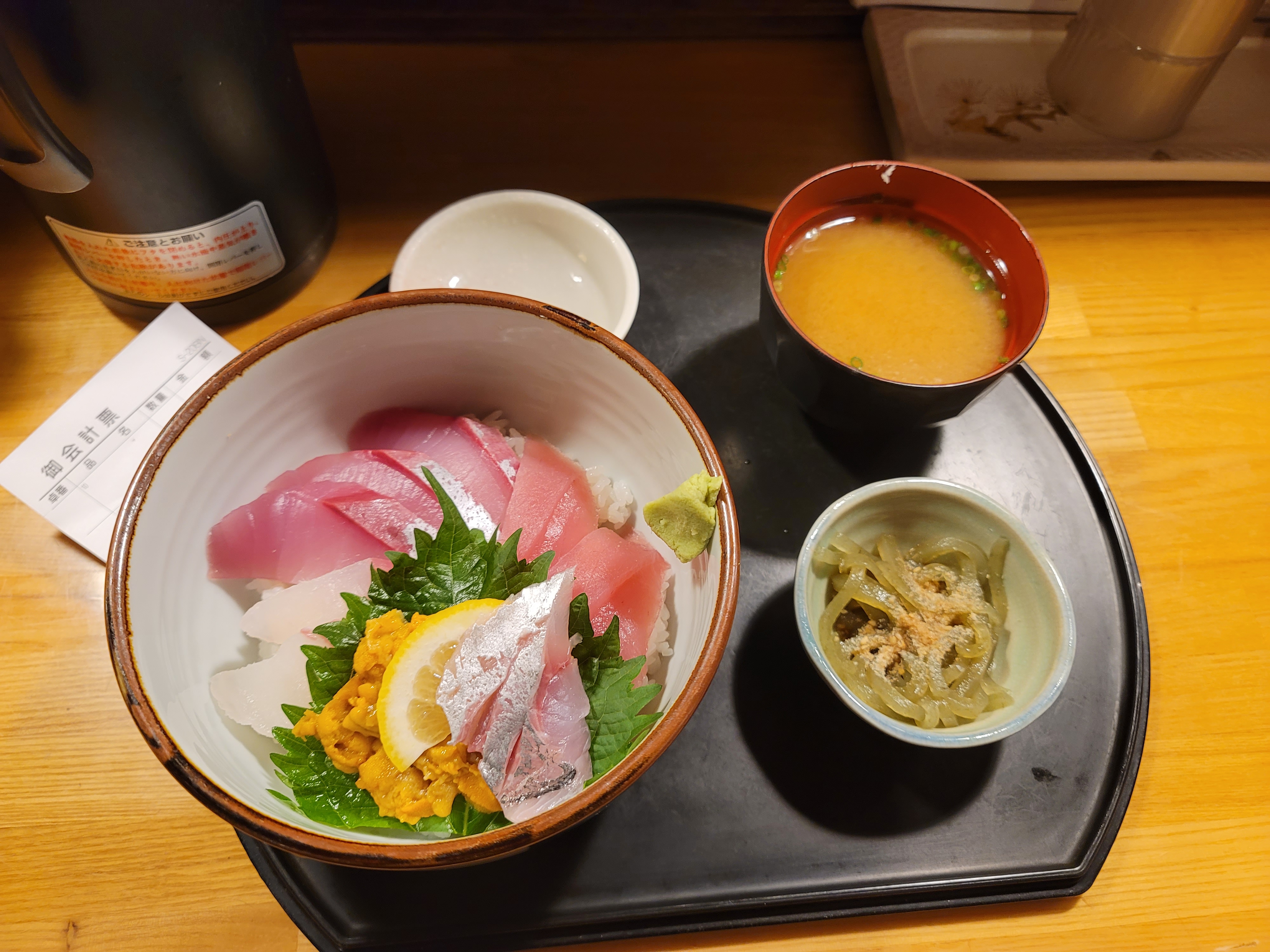 성게를 개인적으로 좋아하다 보니 성게 카이센동을 주문했는데 맛있었다. 엔저의 영향도 그렇고 9500원 정도에 저런 밥이라니 굿!!! 된장국 안의 어묵도 식감이 쫄~깃 하니 좋았다. 나중에 개별 포스팅 하겠지만 옆에 간장이랑 무슨 까나리 액젓 같은 소스도 있는데 같이 먹으면 괜찮다.