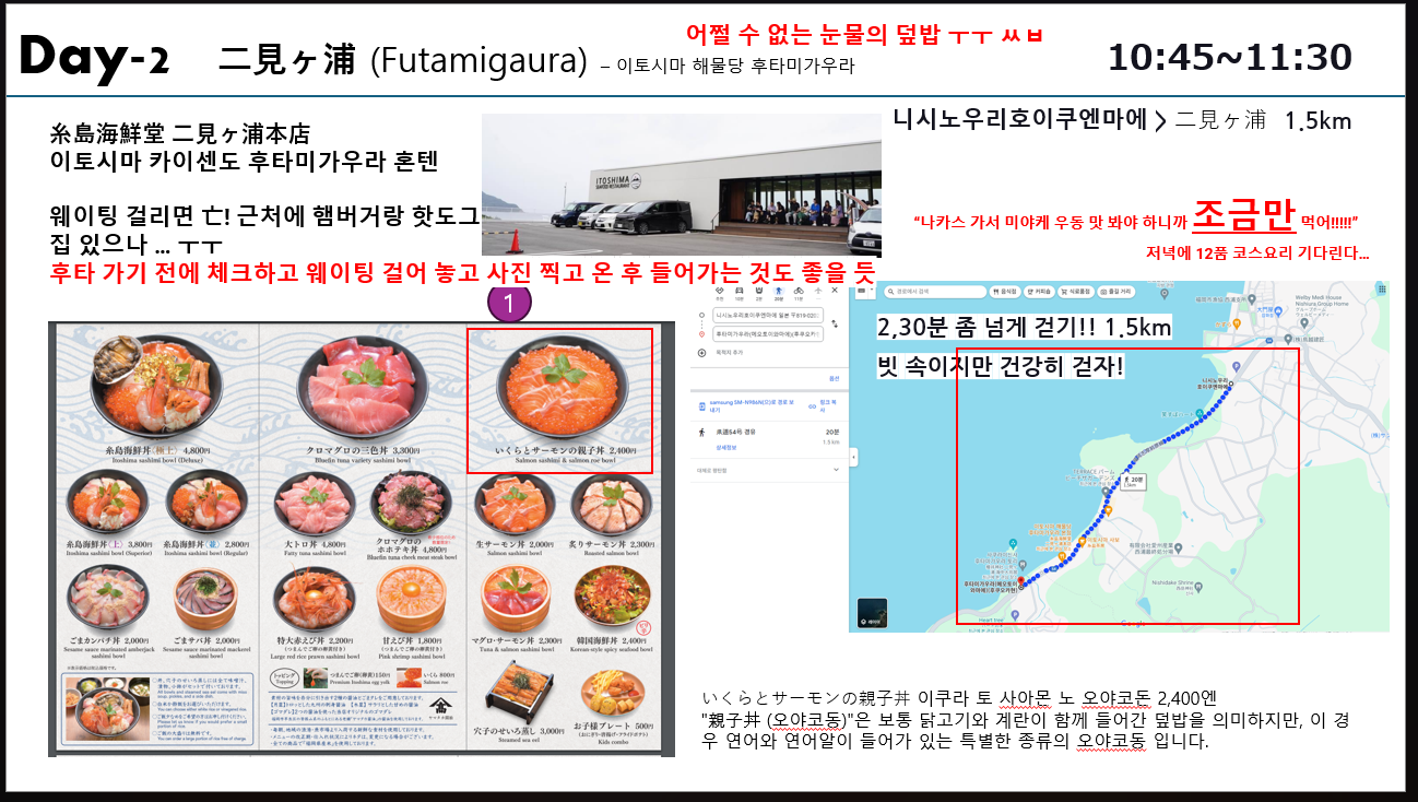 계획: 부부바위를 향해 내려오면서 점심도 생각해야 한다. 원래 점심으론 영화에 나온 미야케 우동 먹으려고 했었는데 부부바위 탐사 일정이 훅, 들어오면서... 점심은 여기서 해결하기로 했다. 다만, 또 아침에 이은 덮밥이다...