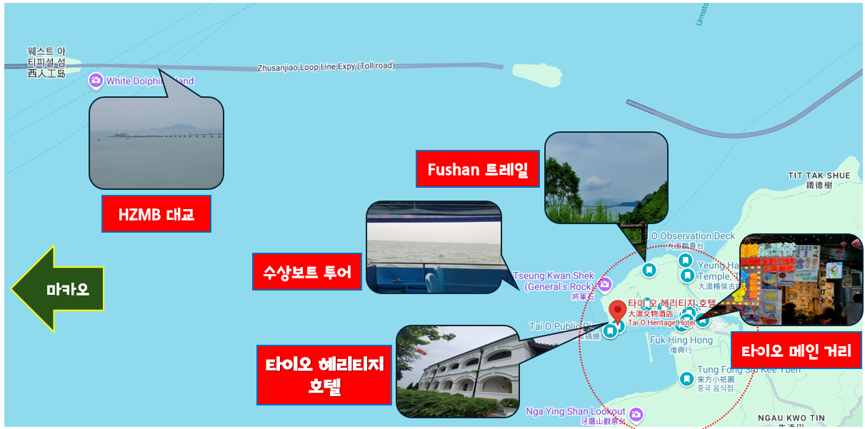 영화 <열혈남아>의 란타우 섬 메인 촬영지를 크게 나누자면 위와 같다. 키스 신 및 홍콩 센트럴과 란타우를 잇는 무이 워 페리 선착장, 장만옥이 일하는 Sea Breeze와 버스 종점이 있는 부이 오, 그리고 좌측 끝의 극 중 장만옥의 고양인 타이 오 어촌마을. 현재는 부이 오가 종점이 아니기 때문에 버스 타면 저 지도의 길을 따라 무이 워 부터 부이 오를 지나 타이 오 마을까지 갈 수 있어 보인다.